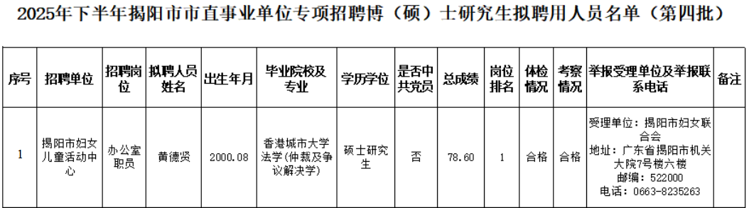 附件:2025年下半年揭阳市市直事业单位专项招聘博(硕)士研究生拟聘用人员名单(第四批)