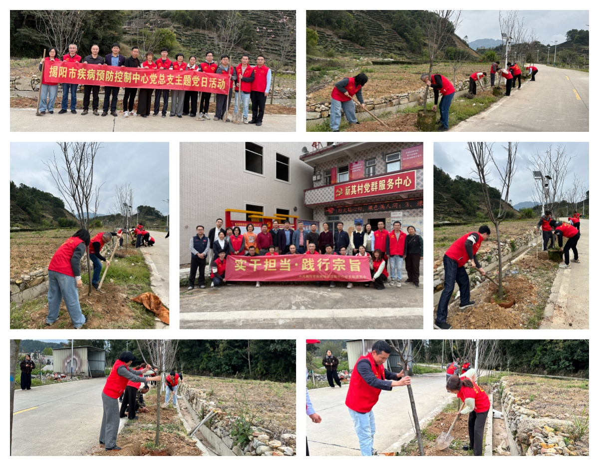 下午,为进一步深化“党旗红·乡村绿”专项行动,2个党组织的党员队伍来到了市疾控中心驻镇帮镇扶村挂钩联系点揭西县五经富镇开展植树活动,以“党旗红”赋能“生态绿”,为推动我市生态文明建设贡献疾控力量。在五经富镇新其村村道边,党员和志愿者们三五成组、齐心协力、配合默契,挥锹铲土,运苗扶苗、栽种填土、踏土正苗,一丝不苟的完成每一道工序。展望未来,辛勤努力种植的那一排排桃花,必将形成一道靓丽的风景线!