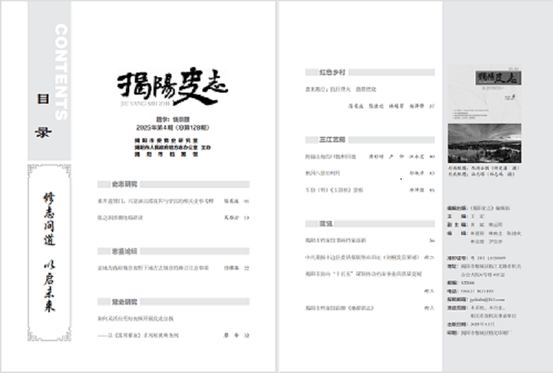 近期,《揭阳史志》2025年第四期编印完成。全书约5万字,设有史志研究、志鉴论坛、党史研究、红色乡村、三江艺苑等栏目。