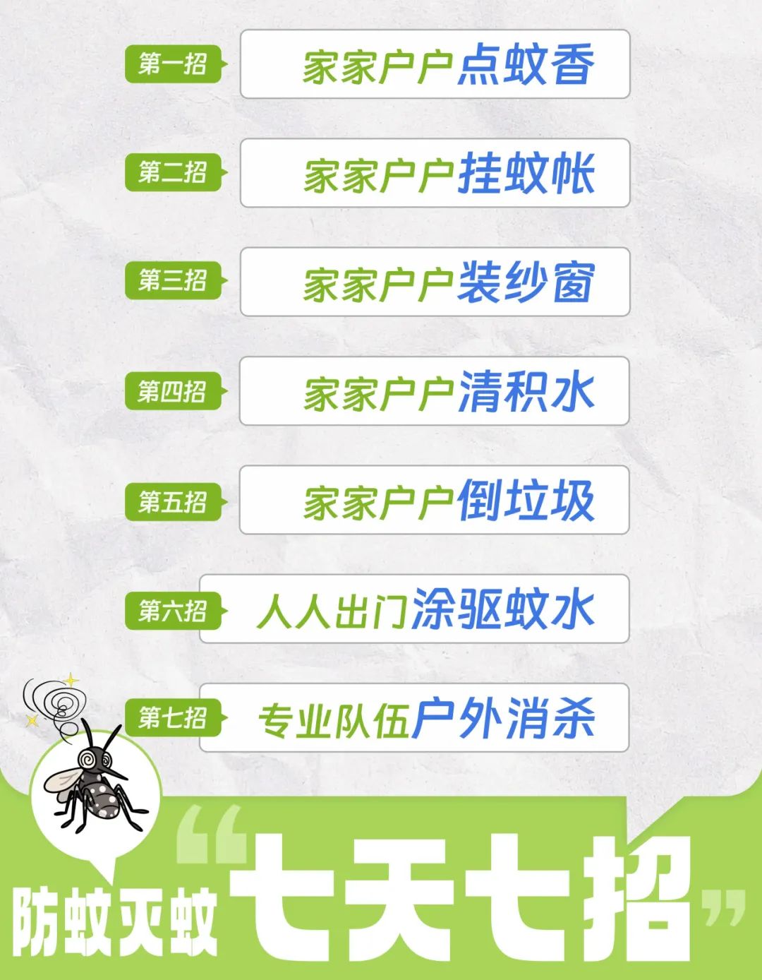 各县(市、区)统筹部署各镇街、村居、行业,聚焦社区、城中村、城乡结合部、背街小巷、建筑工地、拆迁片区“六类重点区域”,农贸市场、商业街区、停车场、公交场站以及其他运输枢纽站场“五类场所”,道路、河道、铁路“三个沿线”,边角地、夹心地、插花地“三类薄弱区域”,确定行动的具体时间,室内室外齐进行,集中力量清除各类积水、垃圾杂物,清理荒草杂草、阴暗角落等蚊虫躲匿场所,统一时间开展灭蚊消杀,降低蚊媒密度。